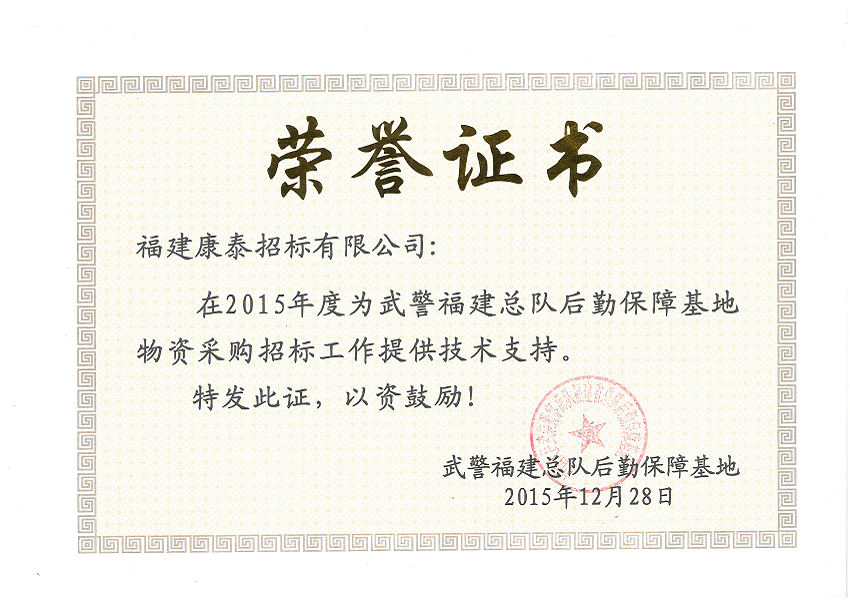 武警福建總隊后勤保障基地授權榮譽證書